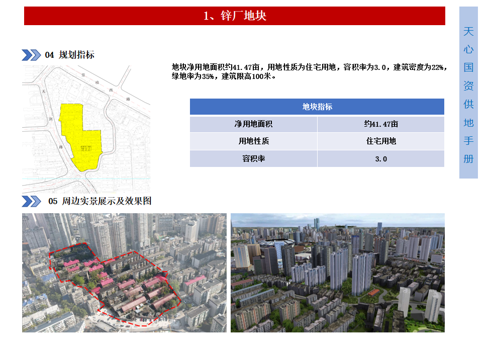 鋅廠地塊占地41.47畝,容積率3.0,建筑密度為22%,綠地率35%,建筑限高100米,緊鄰地鐵1號線侯家塘站,周邊配套成熟,擁有仰天湖小學(xué)(本部)等優(yōu)質(zhì)資源,是打造住宅的理想選擇。