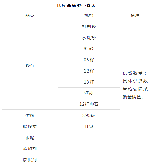 本次征集活動為2025年度第一次原材料供應(yīng)商的征集,征集供應(yīng)商品類為:砂石、水泥、粉煤灰、礦粉、膨脹劑、減水劑、外加劑等,現(xiàn)每年總需求約200萬噸。