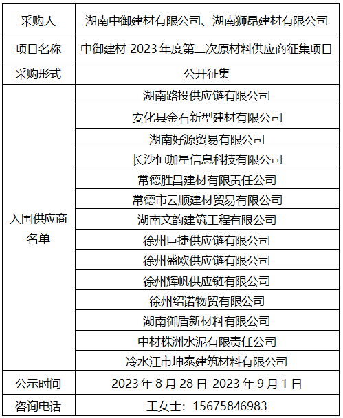 特別說明:請以上入圍供應(yīng)商單位在公示之日起到2023年9月3日17時止至湖南中御建材有限公司進(jìn)行二次商談,若未在規(guī)定時間內(nèi)進(jìn)行商談的則視為自動放棄入圍,將取消入圍資格。